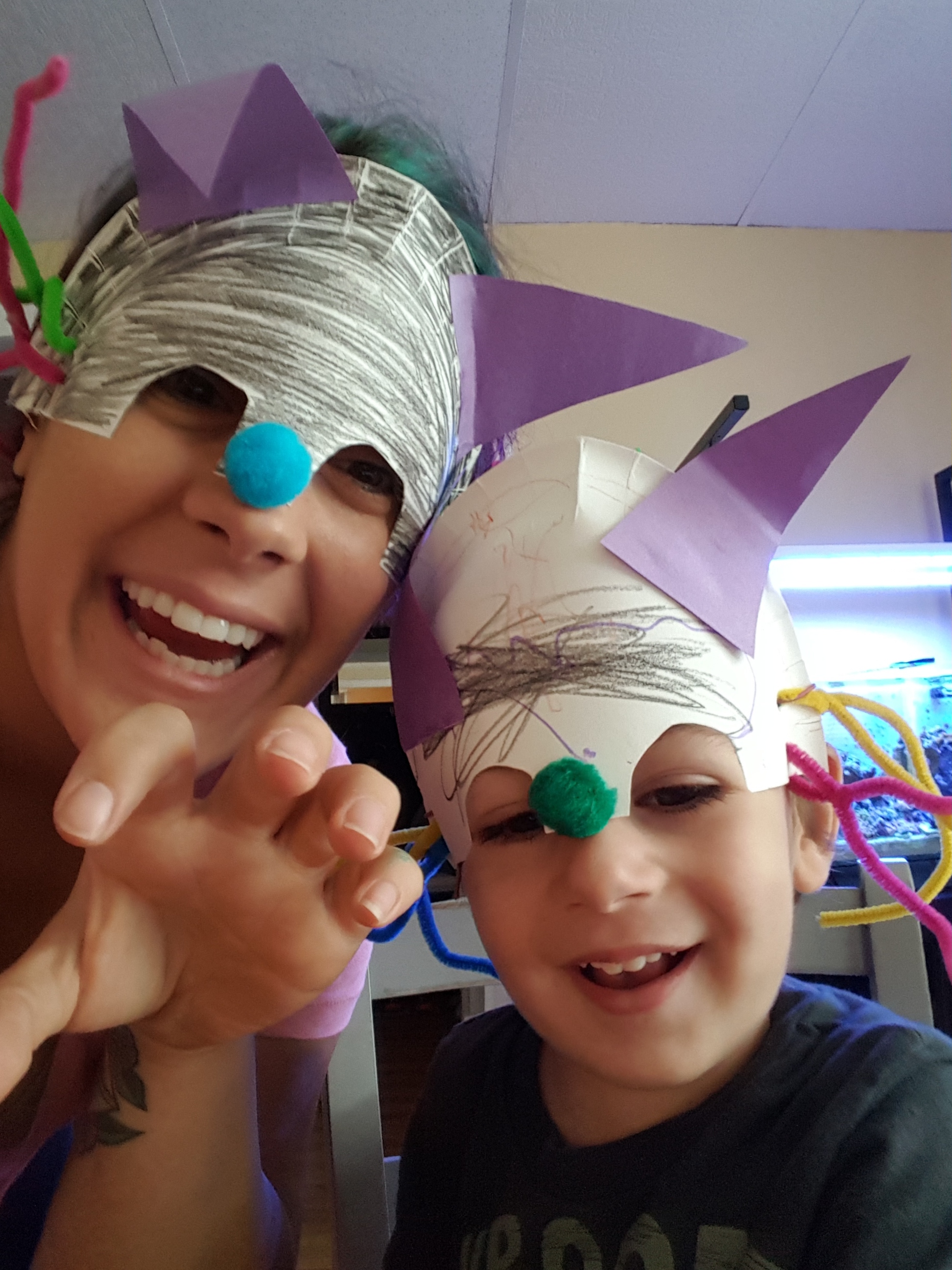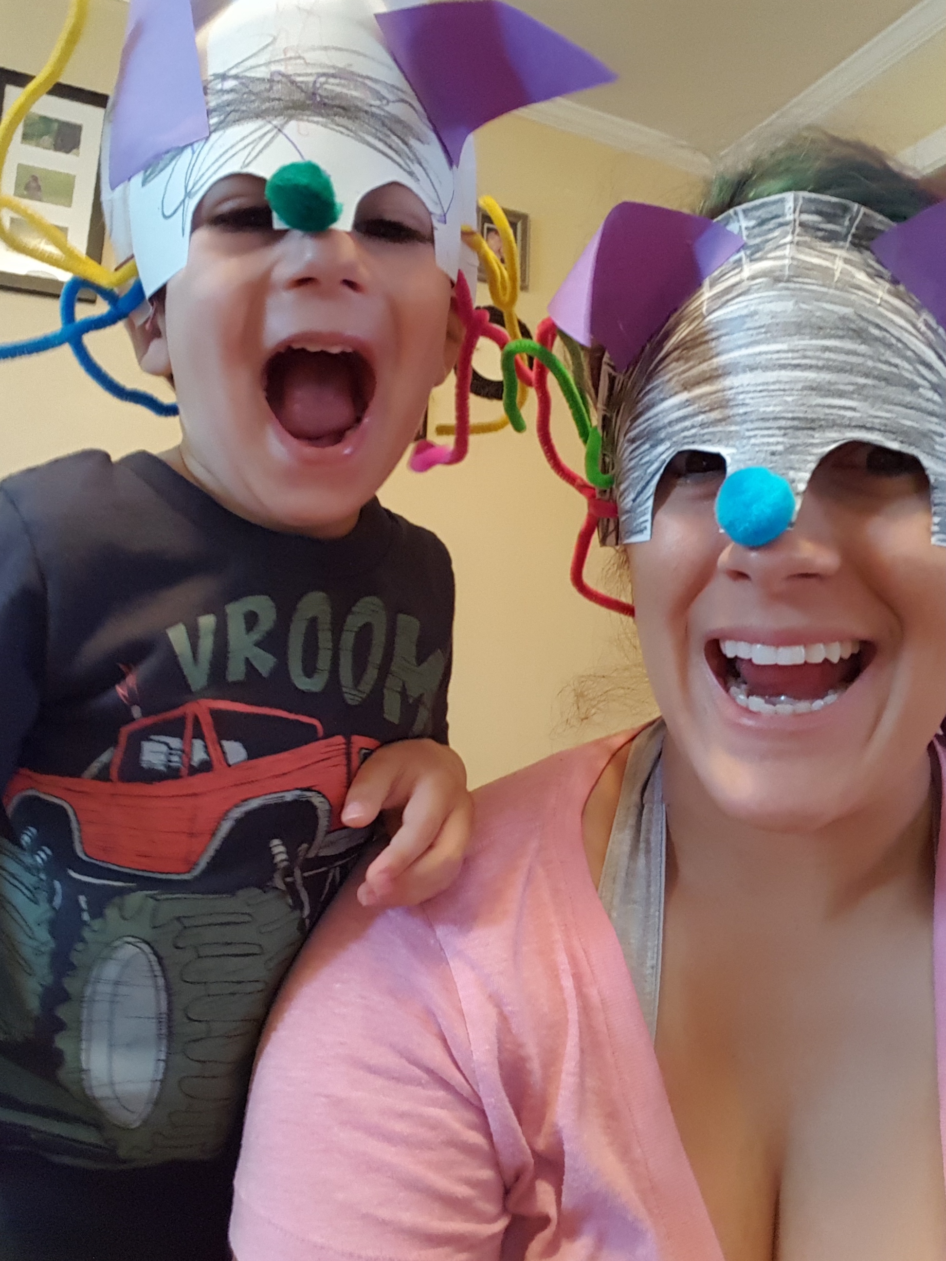 For our art project, i took a paper plate and cut it in half. I then cut out the eye holes and we decorated them to look like cats!